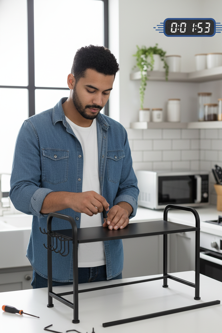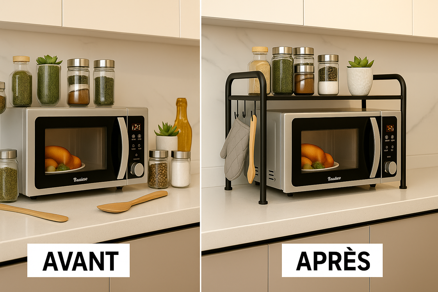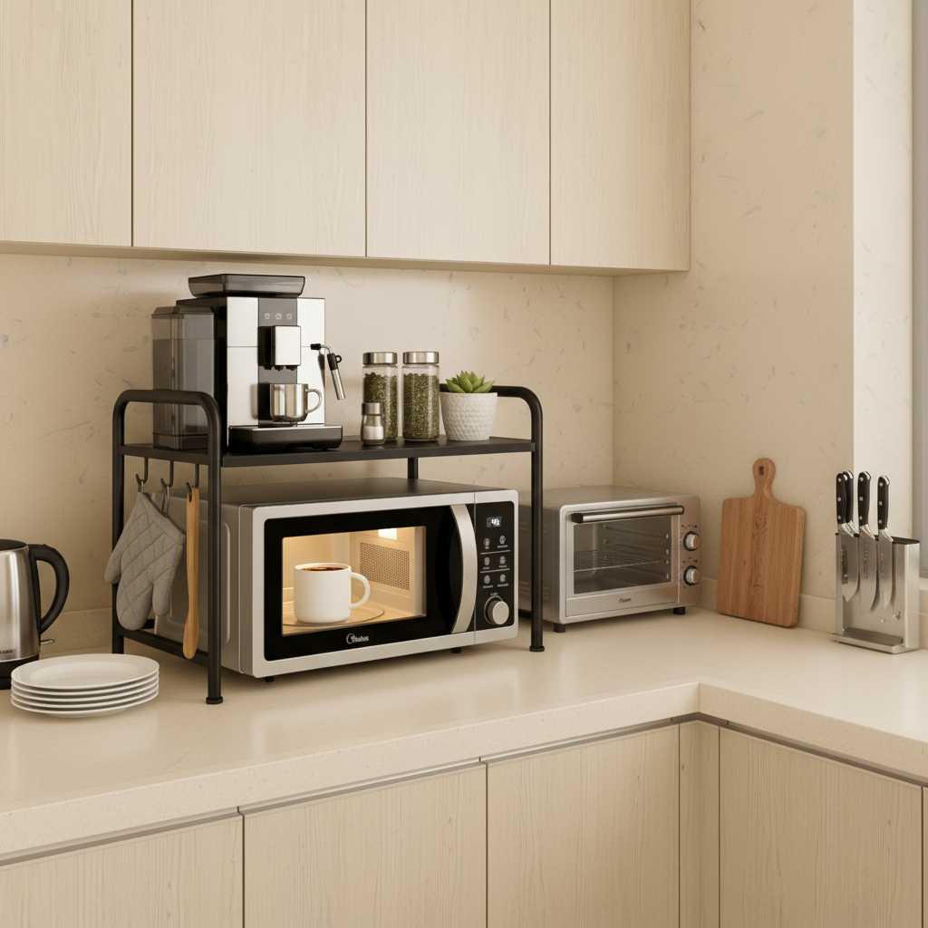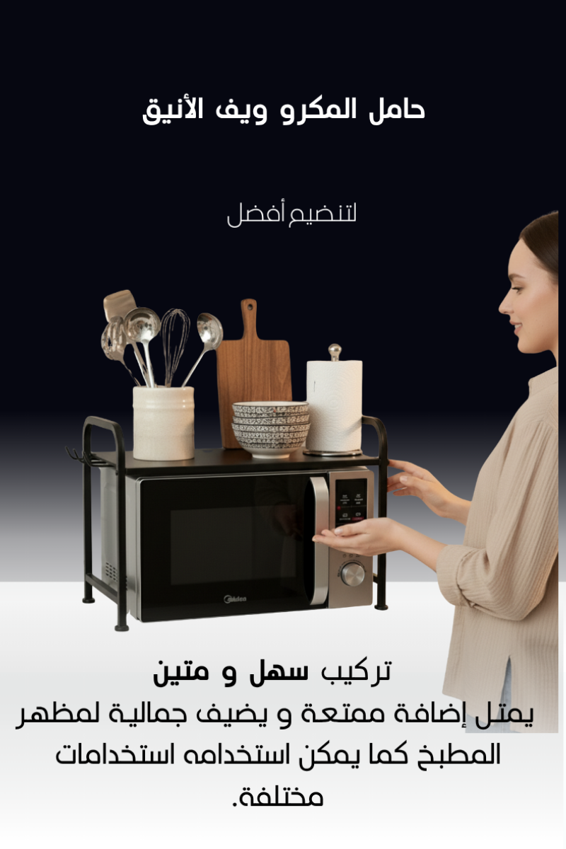 🔹 التنظيم"كاين فوضى فوق الطاولة والمكرو ديما مشغول بالبلايص.""رف الميكرو يعطيك بلاصة إضافية وتنظيم أنيق 👌"