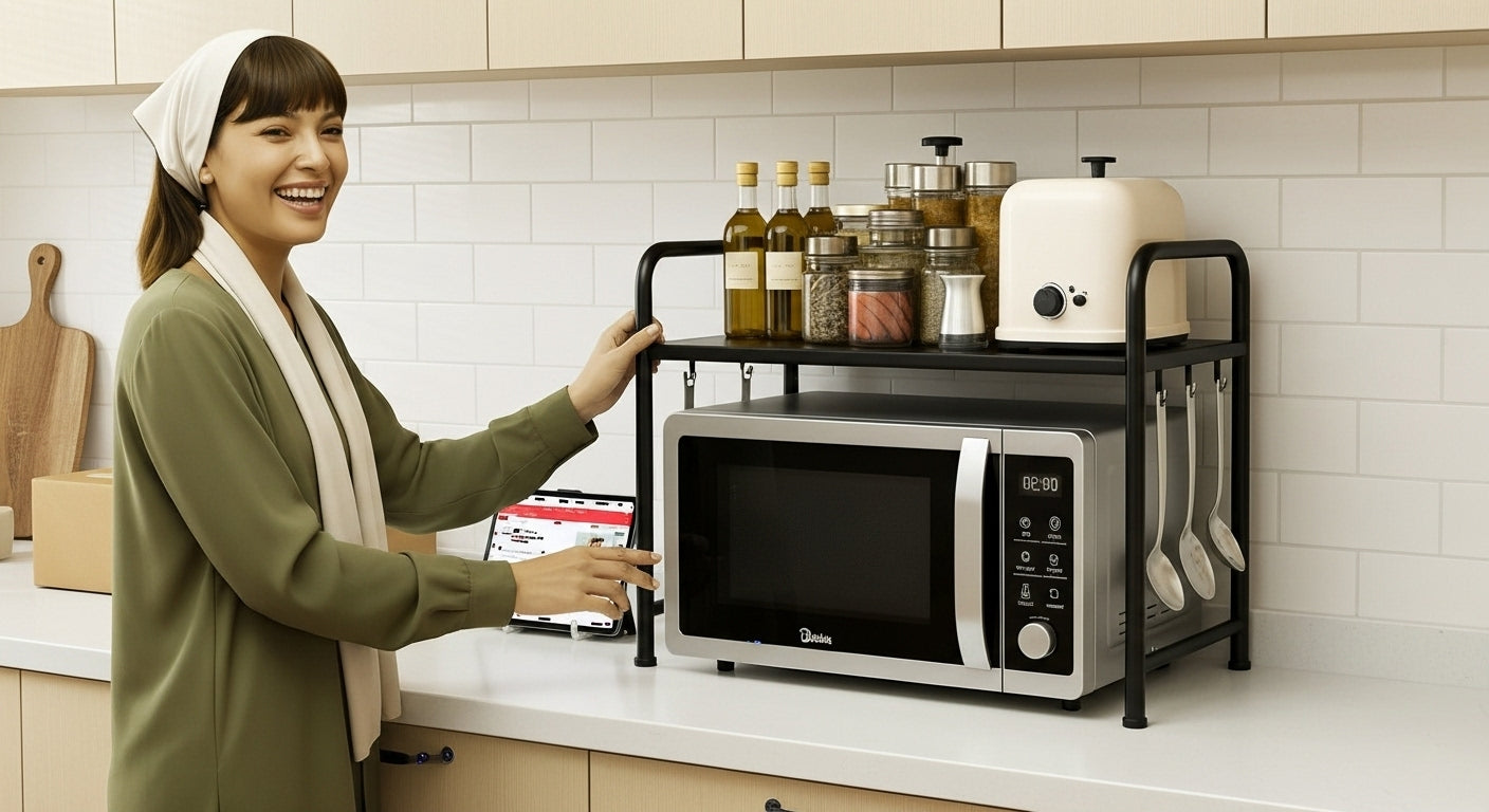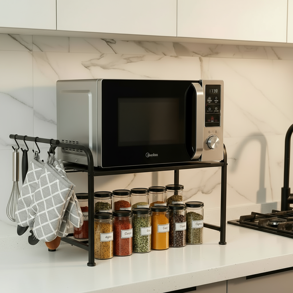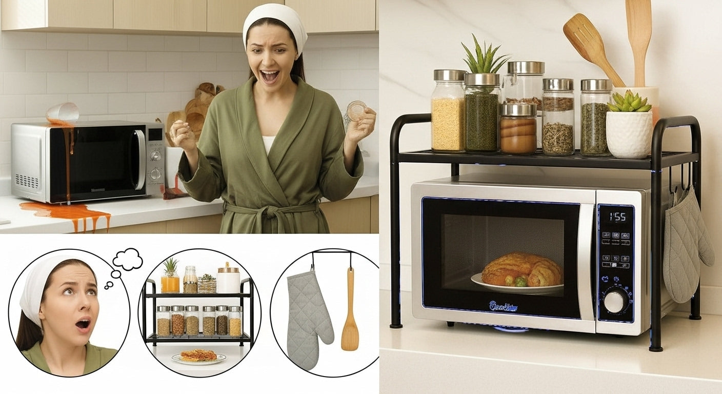 لا تدعي الفوضى في المطبخ – اطلبي حامل الميكرووند العصري الآن ونظمي كوزينتك!